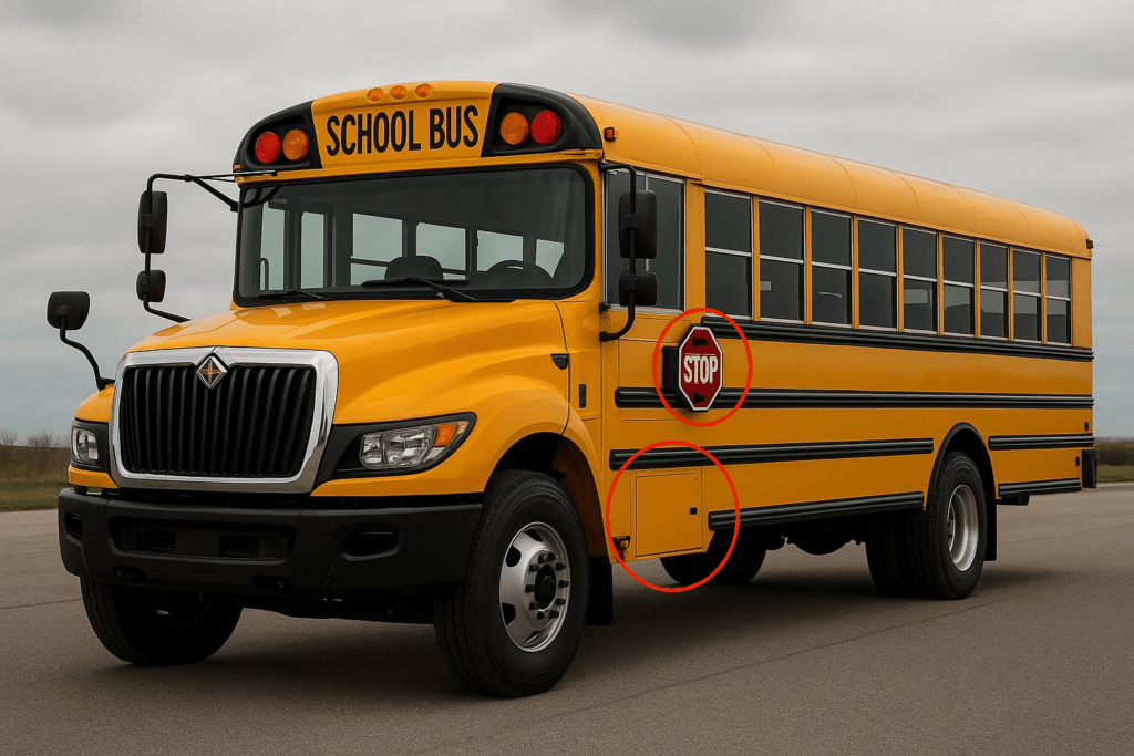 “I would inspect all the same items on the driver side of the bus that are on the door side. These include the stop arm and the battery box.”