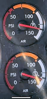 “If The air gauges were not rising, indicating that the system is building pressure, I would pump the brakes until the gauges were below the cut in pressure which is typically between 90 and 100 psi.. I will now continue to observe the gauges to assure the governor is working and cuts off at approximately 120 – 140 psi.“