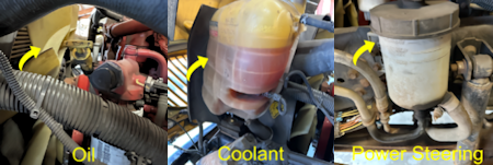 “With the engine off I would inspect these critical fluids for proper level. The engine oil I would check by removing the dipstick, wiping it off with a clean rag, fully inserting it, removing it again and make sure the oil was between add and full. The coolant I would check using the marks on the reservoir. The level must be above the minimum and below the maximum based on whether it was hot or cold. The power steering fluid reservoir also has marks I would use to determine it was at the proper level.”