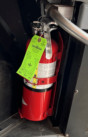 • Inspect for a fire extinguisher that is securely mounted and properly charged